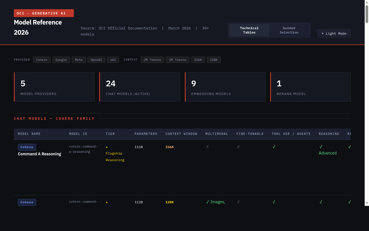 OCI Generative AI has grown fast—Cohere, Google, Meta, OpenAI, xAI—all available, each with multiple variants. Every time I started a new project I had to dig through documentation to find the right model. So I built OCI GenAI Catalog : a reference guide covering 30+ models with a guided selection wizard. What’s inside 24 chat models from 5 providers, with specs: context window, multimodal, tool use, reasoning, fine-tuning support 9 embedding models and 1 reranking model for RAG pipelines A model selection wizard — filter by task, performance tier, and context needs to get a top-3 recommendation Provider summary Provider Models Strength Cohere 5 RAG, fine-tuning Google Gemini 3 Multimodal, long context (up to 1M tokens) Meta Llama 5 Open weights, MoE efficiency OpenAI gpt-oss 2 Reasoning, agents xAI Grok 6 2M context, code specialization Data is sourced from OCI official docs and kept up to date. Check it out at OCI GenAI Catalog .